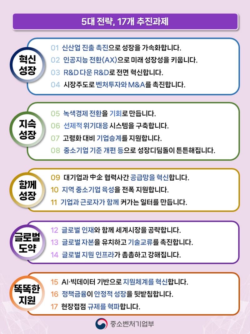 중소벤처기업부는 중소기업의 혁신 성장, 지속 성장, 함께 성장, 글로벌 도약, 똑똑한 지원을 5대 전략으로, 17개 추진 과제를 담은 ‘중소기업 도약 전략’을 29일 발표했다.