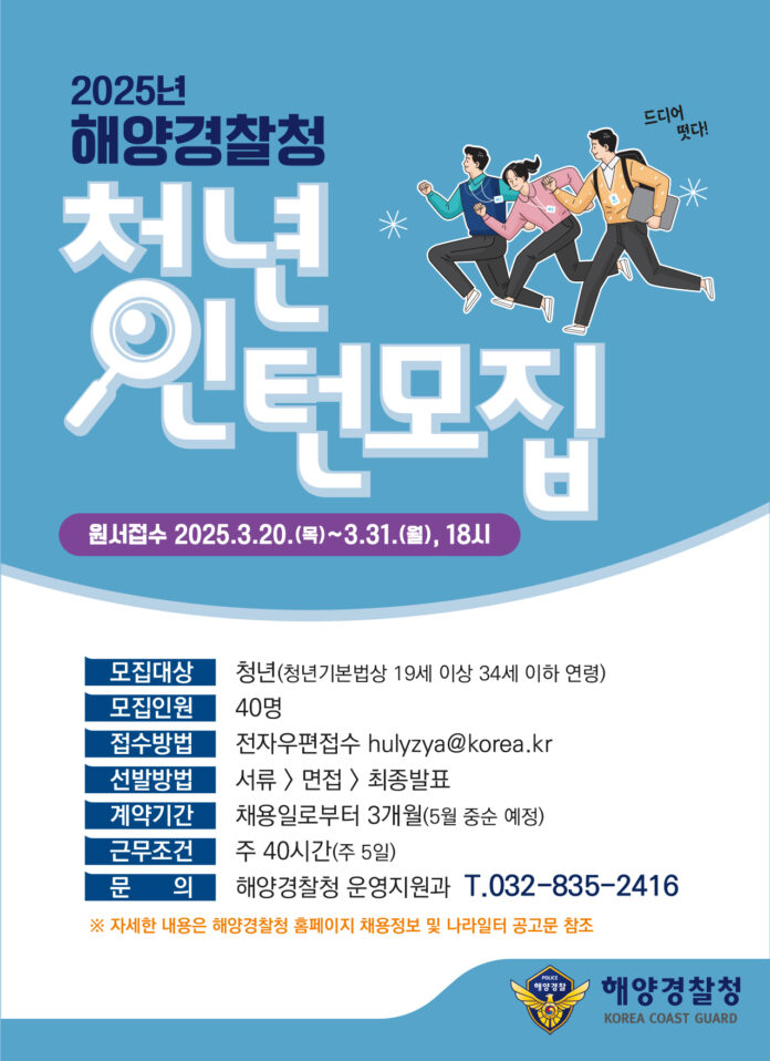 해양경찰청(청장 김용진)은 사회진출을 준비하는 청년들에게 행정기관 정책 과정에 직접 참여하고 이를 경험할 수 있도록 올해 청년인턴 총 200명을 채용한다고 20일 밝혔다.